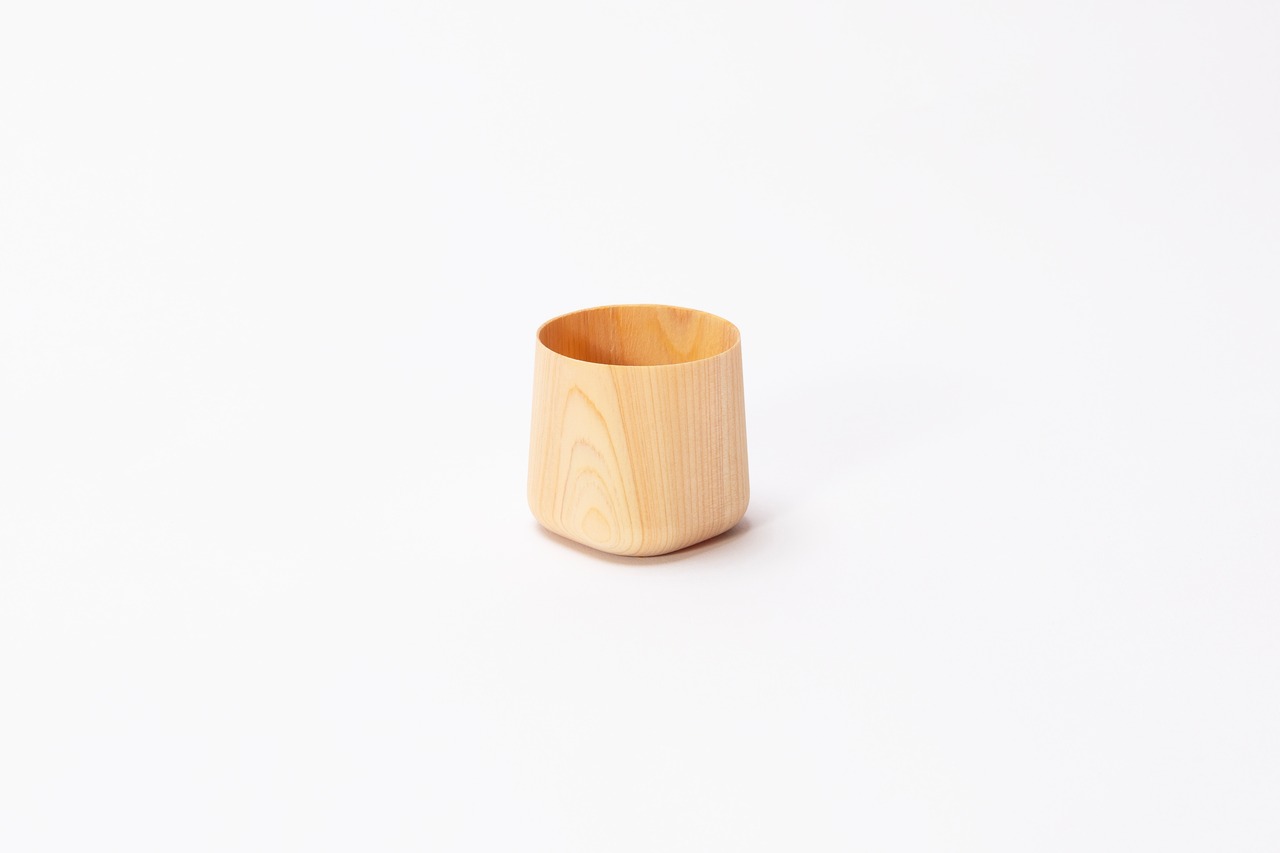まるで光を透かすほど繊細に削り出された、極上のヒノキのコップ。